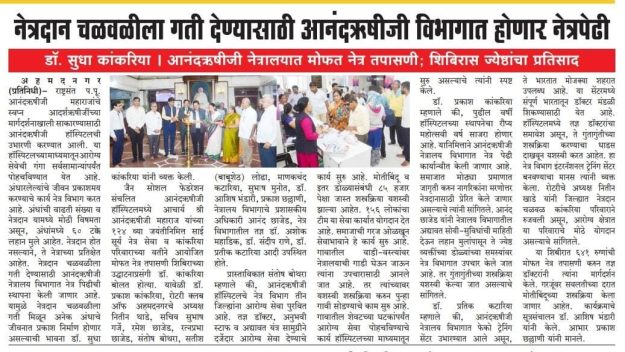 नेत्रदान चळवळीला गती देण्यासाठी आनंदऋषीजी नेत्रालय विभागात नेत्र पेढीची स्थापना केली जाणार आहे. यामुळे नेत्रदान चळवळीला गती मिळून अनेक अंधाचे जीवनात प्रकाश निर्माण होणार असल्याची भावना डॉ. सुधा कांकरिया यांनी व्यक्त केली.