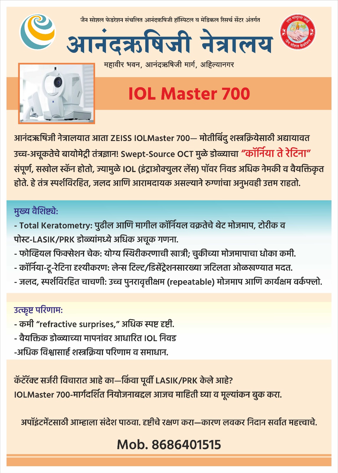 आनंदऋषीजी नेत्रालयमध्ये अत्याधुनिक IOLMaster 700 आता उपलब्ध! कॅटॅरॅक्ट शस्त्रक्रियापूर्वी डोळ्यांची अत्यंत अचूक बायोमेट्री. हाय‑स्पीड OCT तंत्रज्ञानामुळे स्पष्ट व नेमका डेटा. योग्य इन्ट्राऑक्युलर लेन्सची निवड अधिक विश्वासार्ह—कमी आश्चर्ये, उत्तम परिणाम. जलद, नॉन‑कॉन्टॅक्ट, रुग्ण‑अनुकूल प्रक्रिया. प्रत्येक डोळ्यासाठी “परफेक्ट फिट” साध्य करण्यावर आमचा भर. आजच बायोमेट्री बुक करा आणि कॅटॅरॅक्ट सर्जरीसाठी प्रिसिजन‑व्हिजन प्लॅनिंगचा अनुभव घ्या.